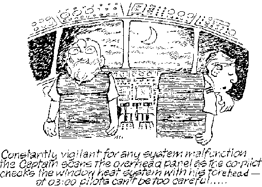 2. SILENCE AURAL WARNINGS: With the advent of a runaway seat, crew members describe noises of a low rumbling nature followed by the words, "Jesus, my seat is out of control" followed by a piercing scream of increasing intensity and pitch, especially in cases of forward runaways. As in all emergencies and in order to comply with C.A.A standardization, the First Officer will silence the aural warning by clamping a hand over the Captain's mouth and advise, "Capt's mouth SHUT, SHUT". From this point on refer to the check list, located on the under side of the Capt's seat cushion.
